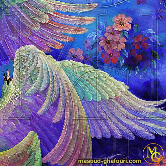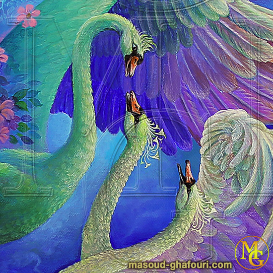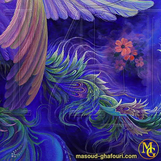 • In this work of the artist This artwork symbolises life and love in an alternating influence on the entire universe. Harmony and emotions are the cornerstones of this artwork. The picture is under a strong influence of the Persian painting with spirally moving elements, which can be seen clearly on the feathers of the birds. Tension and an intimate moment of passion and emotion are expressed by a colorful contrast in the picture.